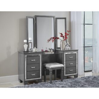 Glamour reigns in the design of the Allura Collection. Framing the vanity dresser and mirror is a decorative beveled mirror accent. High polished crystal-enhanced hardware boldly accents the gray finish.