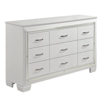 Glamour reigns in the design of the Allura Collection. Framing the dresser is a decorative beveled mirror accent. Alligator embossing and high polished crystal-enhanced hardware boldly accent the white finish.