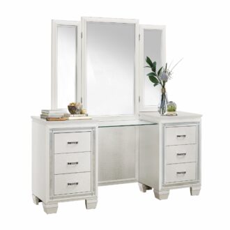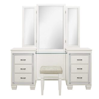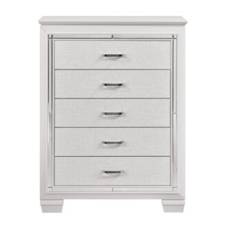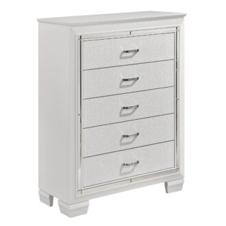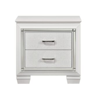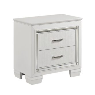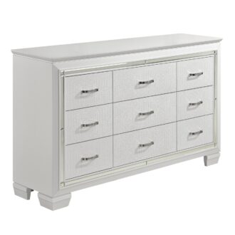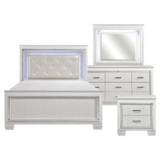 Glamour reigns in the design of the Allura Collection. Framing each piece is a decorative beveled mirror accent that enhances the illumination from the touch-engaged LED backlight of the headboard and mirror, as well as the under-light of the night stand. Alligator embossing and high polished crystal-enhanced hardware boldly accent the white finish as does the pearl-white faux leather crystal-tufted headboard insert of the collection.
