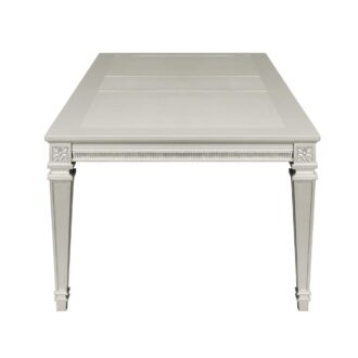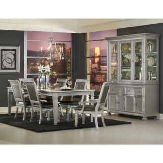 Modern glamour is exemplified in the design of the Bevelle Collection. Acrylic crystals frame the dining table, reflecting the light to create eye-catching drama. Providing contrast to the table finish is the dark gray faux leather of the side chairs and arm chairs.
