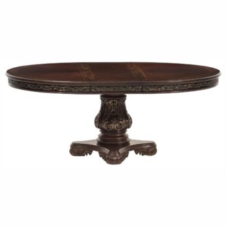 Walking into the dining room that is occupied by the Deryn Park Collection will immediately invoke your love of the traditional aesthetic. Stately from every angle, sophisticated design elements blend to create this beautiful dining table. Burl inset flanks the book-match veneered cherry-finished tabletop. The oval topped single pedestal allows you the flexibility to fit the scale of your dining room. The cherry finish is highlighted by gold tipping that accentuates the traditional feel of the dining table.