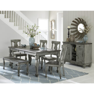 An updated look for the casual country inspired dining space, the Fulbright Collection is a warm and inviting addition to your home. A wire-brushed two-tone gray and coffee finish serves to highlight the solid rubberwood table lending an updated styling to the traditional look. The butterfly leaf allows for easy expansion of the table and convenient storage of the leaf within the table’s structure.