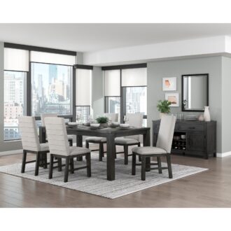 The transitional framing of the Orem Collection will provide a perfect mealtime platform for your casual dining room. The antique black finish of the dining table’s oak veneer creates a versatile decorative accent to your space.