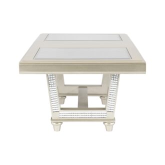 Radiating the iconic beauty of glamorous styling, the Juliette Collection is an elegant addition to your dining room. The silver finish of the collection is reflected in the mirror trim that defines the profile of the pedestal tabletop and base. Inset glass panels top the table, their presence serving to display the embossed and diamond patterned surface. Turned feet lend subtle traditional accent while the decorative elements create the glamorous aesthetic.