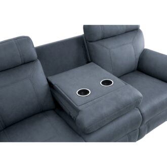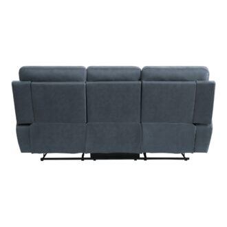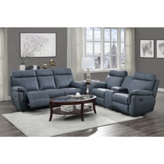 The modern profile of the Clifton Collection serves to provide comfort, function and style to your home’s casual living room. The blue polished microfiber that covers the plush arms and seating of the sofa lends to the decorative versatility of the collection. The sofa features dual reclining ends as well as a drop-down center seat back with cup-holders and tabletop. Manual motion mechanisms operate with the pull of a side-mounted tab, that once engaged, take you from seated to reclined in an easy motion.
