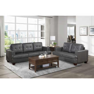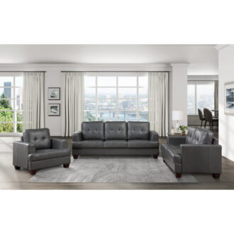 With a profile that hints at modern design and a color palette that serves as a neutral accent to your home, the Hinsall Collection will be a welcome and comfortable addition to your living room. Premium faux leather upholstery covers the sofa and is available in gray for versatile decorative styling. Track arms and contour stitch tufting further lend to the modern look.