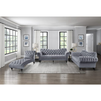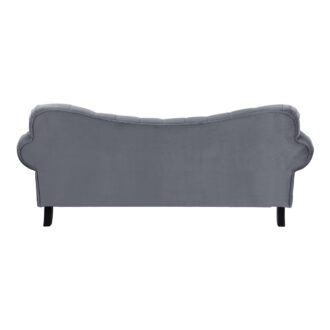 The exquisite glamour that accents your home will pair perfectly with the Rosalie Collection. The dramatic curves of the sofa give way to traditional accent in the form of rolled arms, button-tufting, turned legs -with black finish- and nailhead trim. The velvet covering of the collection is offered in dark gray to perfectly complement your living space.