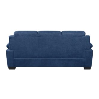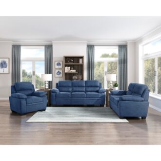 A modern profile serves to lend visual contrast and support to the plush seating and pillow-top arms of the Holleman Collection. The blue textured fabric cover acts as a neutral palette for your decorative preferences. Channel tufting accents the lower seatbacks of the sofa providing subtle accent to the collection.