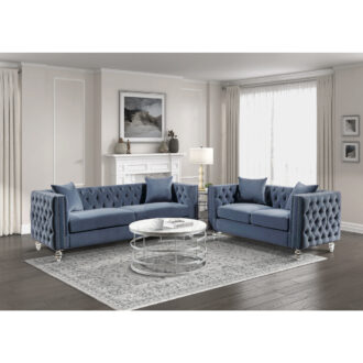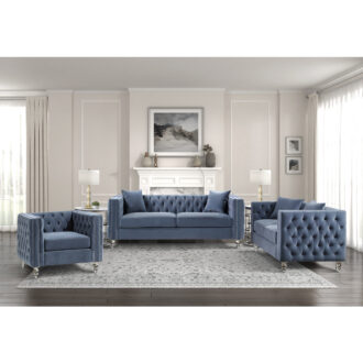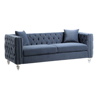 Glamorous from top to bottom, the Orina Collection exemplifies the radiant styling that defines your personal style. From the nailhead accent, dark blue velvet button-tufted cover, down to the acrylic legs that support the sofa, each classic accent culminates to achieve the elegant aesthetic you desire for your home’s décor.