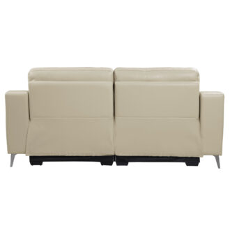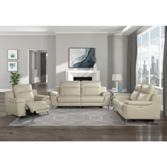 Easing you into plush relaxation, with just the push of a button, is the Antonio Collection. The sleek profile of the ultra-modern design transforms bringing you from your seated position to reclined via the power motion mechanism. The sofa is supported by chrome finished metal legs and covered in beige top grain leather match upholstery that further lends to the modern styling.