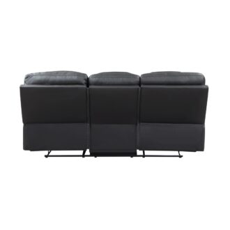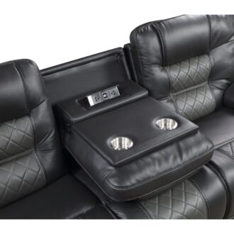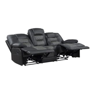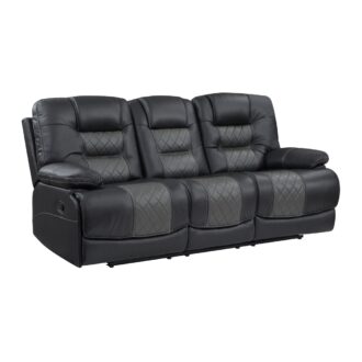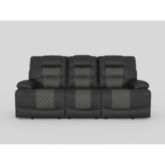 The transitional profile of the Fabian Collection is given a modern edge with the diamond stitching of the seats and electronic conveniences. The sofa features manual reclining mechanisms allowing for ease of motion when going from seated to reclined. The sofa’s drop-down seatback that has cupholders, tabletop, receptacles, and USB ports. Breathable faux leather upholstery is featured in a complementing contrast of two-tone gray for perfect pairing to your home’s décor.