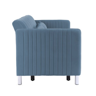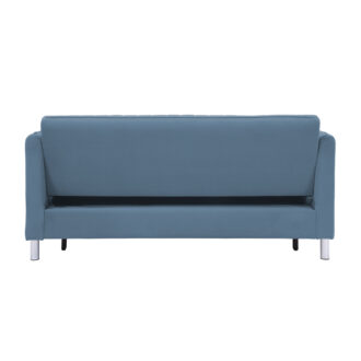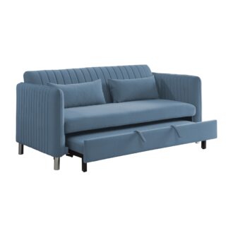 your household. The pull-out bed and click-clack mechanism seat back of this sofa engage to create a platform for sleeping or relaxing. Offered in a blue velvet cover for decorative neutrality and soft touch, the classic design furthers the placement ability within a number of home environments.