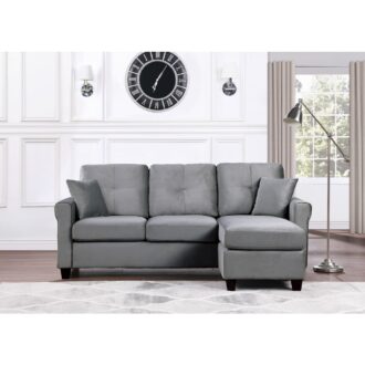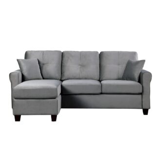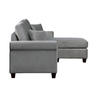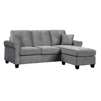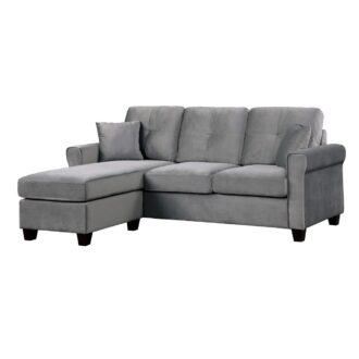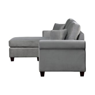 Casual contemporary styling creates a modern look for your living room in the Monty Collection. The reversible configuration of the three-seat sectional comes in the form of the ottoman that is utilized as the base for the reversible end chaise cushion, creating the option of a left or right extension of the sofa seating. The gray velvet cover paired with the streamlined profile of the sofa lend to the modern look of the collection.