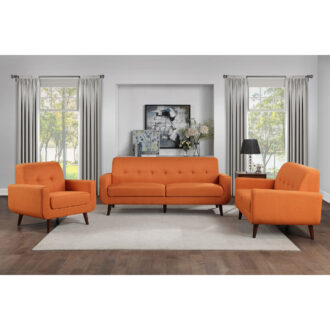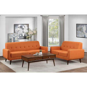 Mid-Century modern design is the inspiration for the Fitch Collection. Wide, dramatically curved arms rise to the straight back that is synonymous with this classic style. Contoured stitching on the seatback lends further accent to the sofa’s modern profile. The Fitch Collection is offered in orange fabric, creating a neutral palette to inspire your decorative whim.