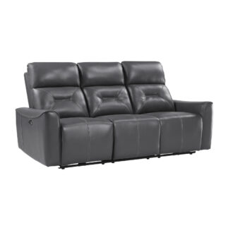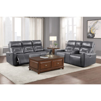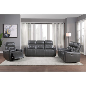 The unfettered modern design of the Burwell Collection presents as a statement of your preference for contemporary design. The sofa is featured with power motion reclining mechanisms, taking you from seated to reclined in an easy motion. The streamlined track-style arms, clean lines and solid front design of the seats further lends to the modern look. The collection is offered in cobblestone gray textured faux leather.