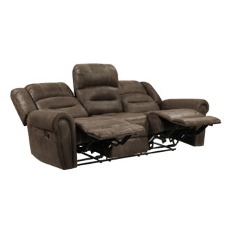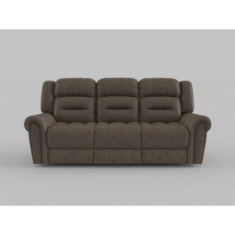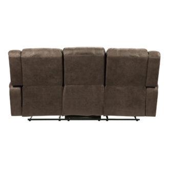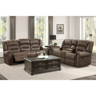 The plush seating that is contoured for your comfort is paired with transitional styling resulting in the classic look of the Creighton Collection. The available brown polished microfiber covering that covers the sofa creates a style that will blend effortlessly with your transitional decorative preference. The sofa features dual reclining ends and manual motion mechanisms operating with the pull of a side-mounted tab, that once engaged, takes you from seated to reclined in an easy motion.