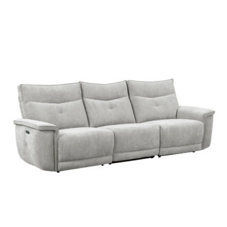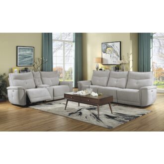 Providing ample seating in modern form the Tesoro Collection. The classic sofa is book-ended by USB port enhanced end power recliners – allowing for maximum versatility when planning the layout of your living room. Mist gray fabric provides a neutral palette for your decorative preferences. The power reclining mechanism of the reclining ends and armless chair brings you to your desired position with a touch of the button.