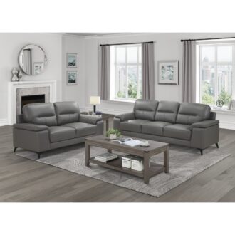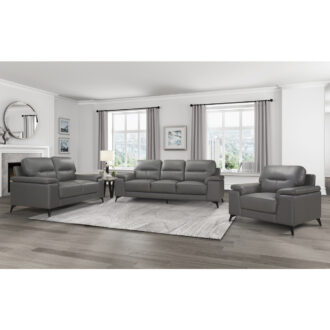Styled for the modern home, the Mischa Collection’s sofa blends the luxurious feel of leather with the comfort of plush seating. The dark gray top grain leather cover, with faux leather, enhances the sleek profile of the collection. Contoured pillow-top arms and black metal legs further enhance the modern stance. Coordinating love seat and chair are available as well as an optional silver top grain leather cover with faux leather match.
